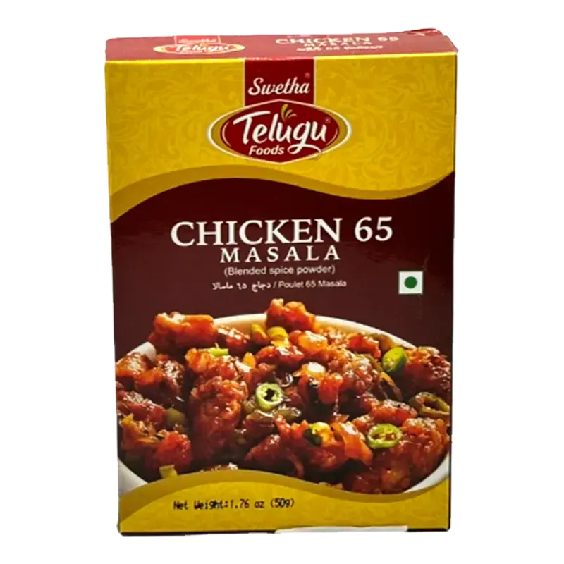 Sweetha Telugu Foods Chicken 65 Masala is a flavorful blended spice mix specially crafted to prepare the iconic South Indian dish, Chicken 65. Made with a carefully balanced combination of aromatic spices, this masala delivers the perfect blend of heat, tang, and savory depth that gives Chicken 65 its signature taste and vibrant color. Ideal for marinating, frying, or stir-frying, it helps you achieve restaurant-style results at home with ease. Conveniently packed for freshness, this masala is a must-have for lovers of bold and authentic Indian flavors.